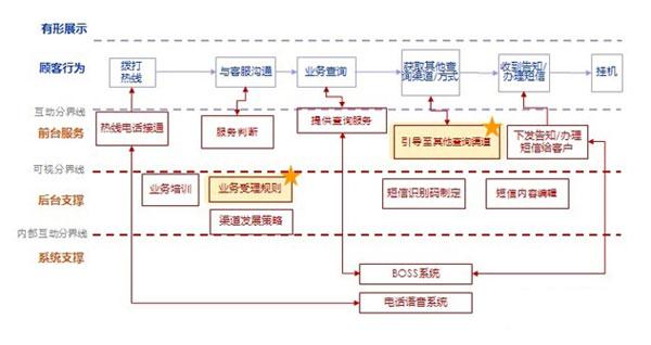 另外,服务蓝图还包括“结构要素”与“管理要素”两个部分。服务的结构要素实际上定义了服务传递系统的整体规划,包括服务台的设置、服务能力的规划;服务的管理要素则明确了服务接触的标准和要求,规定了合理的服务水平、绩效评估指标、服务品质要素等,以此制定符合“客户导向”的服务传递系统,首先关注识别与理解客户需求,然后对这种需求做出快速响应。介入服务的每个人、每个环节都必须把“客户满意”作为自己“服务到位”的标准,下图为完整的10086热线——消费情况查询服务蓝图: