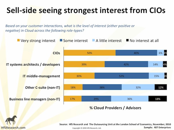 第二,推动云计算的力道是从上而下的。当越来越多的企业领袖开始认识云计算时,便会要求CIO开始为企业规画导入云计算的蓝图。供应商表示,当他们与企业CIO接触时,半数CIO展现出对云计算的强烈兴趣,相较之下其他的IT专业人员就没有这么热衷了。