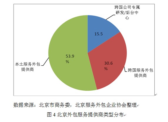 目前,北京开展离岸服务外包业务的企业构成十分丰富,北京市跨国服务外包提供商占30.6%,跨国公司专属研发/后台中心占15.5%,本土服务外包供应商占54%(如图4所示)。跨国公司与本土服务外包企业已经在北京形成了良好的生态环境,建立了高效的互动关系,有效的带动了离岸服务外包业务的发展。
