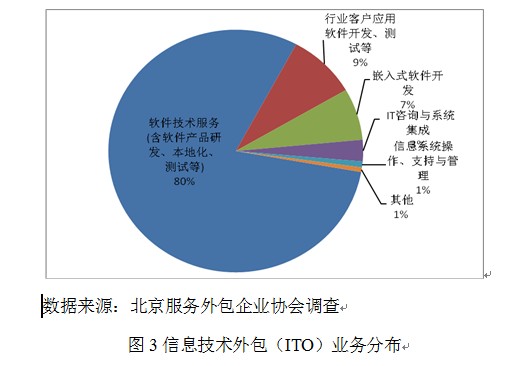 在信息技术外包领域中,软件技术服务(包括软件产品研发、本地化与测试等)、行业应用软件开发、嵌入式软件开发分别占80%、9%与7%,已经形成了北京离岸ITO服务外包的技术优势领域(如图3所示)。