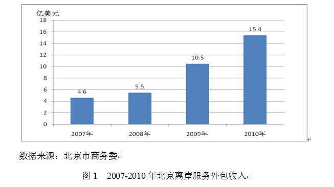自2003年以来,伴随着全球产业转移步伐加快,凭借着独特的市场、人才、技术、基础设施等综合优势,北京服务外包产业进入了一个新的发展期。近十年来,北京服务外包产业保持了快速增长的势头。2010年,北京离岸服务外包执行额达15.4亿美元,年复合增长率超过了40%,十年增长了22倍,始终保持全国领先地位(如图一所示)。
