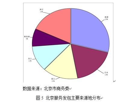北京服务外包来源国分布呈现较强集中性,本着“深耕日本市场,开拓美国市场,培育欧洲市场”的基本策略,北京服务外包产业有重点、有计划、有步骤的推进这三个市场的开拓工作,目前美、日、欧三大核心业务圈的格局已经形成。2010年,美国、日本、西欧三大区域所占份额分别为29%、18%及30%,覆盖了北京市离岸市场近80%的份额。