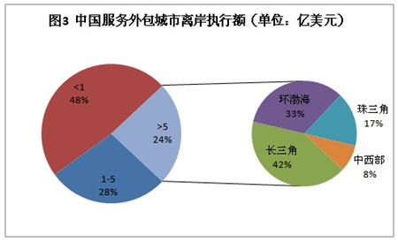 同时,从城市的离岸外包收入来看(详见图3),中国大部分城市的离岸服务外包业务比重比较小或者没有离岸业务,有将近一半的服务外包城市(全部为非示范城市)的离岸执行额低于1亿美元。由此可以看出,虽然越来越多的非示范城市加入到发展服务外包产业的行列中来,但它们在中国及全球的竞争中力量还比较微弱,尤其是开拓海外市场承接离岸外包的实力还不够强大,需要在未来的发展中加大力度,提高发展速度,提升产业规模。