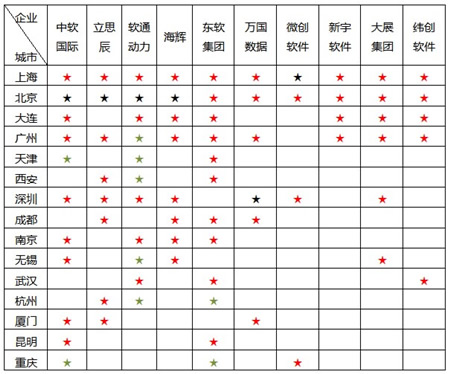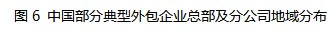 在调研服务外包城市的同时,我们对国内一些典型的服务外包企业做了访谈,通过统计发现,龙头企业总部大多选在北京、上海、深圳等外包产业起步较早、综合优势好的一线城市和沿海城市,同时大多数龙头企业在上海、北京、大连、广州、深圳等沿海城市设立分公司,而在天津、西安、无锡、重庆等地设立运营中心或办事处。