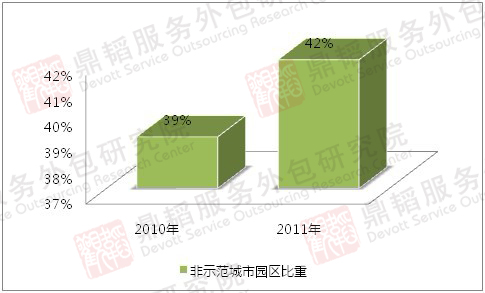 作为城市推动产业及经济发展的载体,各类产业开发区及园区长期以来承担着推动各地服务外包产业发展的实际工作及重任,已经成为推动产业发展的关键点及着力点。尤其是自2006年商务部“千百十”工程发布以来,我国服务外包园区数量已经超过347家。进入2012年,伴随着我国各级政府及总体经济向一个新的五年发展周期过渡及调整,整体服务外包产业发展也进入调整期,鼎韬2012年度服务外包园区TOP10专项调研统计结果显示,我国服务外包产业园区第一轮的建设及发展浪潮已经进入高潮,园区建设及运营开始回归理性阶段,并呈现诸多新的特征及趋势。 1. 非示范城市园区新增提速,二三线城市推动园区扩建浪潮 近年来,越来越多的非示范城市开始重视并重点培育服务外包产业,大力加强园区的建设力度,为引进服务外包企业入驻、引进和培养服务外包人才搭建载体设施、提供产业环境。同时,随着我国服务产业的二次梯度转移,从一线城市向二三线城市转移趋势的不断加强,同一线城市对比拥有较大土地开发资源的二三线城市,成为建设大面积全新服务外包园区浪潮的主力军。调研统计结果显示,在新增以及扩建园区的城市中,非示范城市的崛起显而易见,如图一所示,非示范城市的园区新增比例远远大于市场城市,占据总数的74%,而示范城市只占据其中的26%;在非示范城市外包园区的建设比例图(见图二)中我们也可以看出,数量比例从2010年的39%提升到2011年的42%。 从2011年新增服务外包园区的地理位置分析,长三角地区的园区增长率独占鳌头,占据总数的38%,同时,长三角集群的园区建设也同全国一样呈现由成本较高的示范城市向成本较低的二三线非示范城市转移的趋势。如图三所示,2011年长三角集群新增园区有70%分布于非示范城市,只有30%位于示范城市;而中西部地区和环渤海地区的园区发展也不甘落后,以增长23%的比例值紧随其后;珠三角地区略逊色于其他地区,增长率为15%。 另外,在调研和分析服务外包园区发展过程中,我们发现中国很多服务外包园区“雷声大雨点小”,外包园区在最初规划和招商阶段投入大量的人力、物力和财力,并大力宣传园区的定位、发展目标并进行招商引资活动,但是在轰轰烈烈一两年之后,园区的发展情况和宣传就销声匿迹了。通过访谈,我们发现一部分外包园区由于某些方面的原因,例如招商过程中引进了其它产业的企业,或者园区外包产业发展不起来等等,放弃服务外包转向其它产业;还有一部分园区虽然仍旧在做服务外包行业,但是宣传和推广跟不上,任产业和企业自由发展,园区处于“无生命迹象”状态。这些服务外包园区与国内的大连软件、中关村软件园、西安软件园等园区相比,园区的发展活力比较差,通常园区的寿命比较短。 2. 软件外包仍旧是园区的热宠,新兴业务开始备受关注 我国的服务外包产业于20世纪90年代中期开始萌芽,最初的服务外包形式主要是软件业以及信息化为标志的经济体系,服务外包的萌芽主要体现在软件园的建设上。随着我国服务外包产业的出现和发展,软件园开始向外包园转型,而且由于国家对外包业的扶持也是从软件外包开始的,因此,外包园中发展软件外包业务的园区占据大半;进入2006年,我国服务外包产业进入一个快速发展期,期间IT服务以及金融外包发展迅速,动漫、生物医药、金融外包、呼叫中心以及创意文化等逐渐发展起来。作为近几年新兴产业中的佼佼者,电子商务、云计算产业等也迅速成为外包园区发展高度关注的对象。结合各业务类型的园区从成立的时间维度进行了统计分析(见图四),开展软件外包业务的外包园区中有54%是2006年之后成立的,2000年之前成立的园区不到13%;呼叫中心业务作为重要的BPO业务,从2006开始快速发展,开展呼叫中心业务的园区中有75%成立于2006年之后;开展金融外包业务的园区中,有80%的园区成立于2006年之后,由此可见,2006年“千百十”工程启动以来,金融外包产业成为国家和地方政府关注和扶持的重点外包产业之一,金融外包园区作为新兴载体,在这一时期得到了长足发展。生物医药是传统的垂直产业,开展生物医药研发和制造的园区在每个时间段都有成立,从图中可以看出开展生物医药研发外包业务的园区成立的时间也是几乎均衡的分布在三个时间段,2000年之前29%,2006年之后35%。而开展电子商务外包业务的园区有将近90%成立于2006年之后,这是因为2007年中国电子商务进入迅速发展的爆发期,电子商务产业的快速增长带来了大量的电子商务外包业务,从而催生了大量发展电商外包业务的园区。 3. 企业和人才成为影响服务外包园区发展的核心要素 产业规模是衡量服务外包园区产业发展状况和水平的核心指标。企业是中国服务外包园区发展的核心和关键。从产业聚集和发展的角度,没有企业,就没有园区的发展。企业数量和人员规模是衡量一个园区服务外包产业发展状况的核心指标。鼎韬针对国内100家服务外包园区的企业数量和50家园区的从业人数进行了不完全统计,统计结果显示(见图五),国内企业数量超过600家的大型园区和企业数量少于30家的小型园区数量都较少,各自只占所统计园区总数的11%和6%;而拥有100-300家企业的园区和30-100家企业的园区数量总数最多,合计占园区总数的69%,分别为36%和33%;园区企业数量为300到600家的园区约占所统计园区总数的14%,比