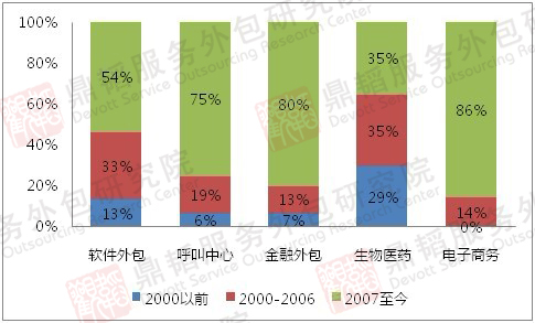 图四 中国服务外包园区按业务类型分析成立时间分布比例