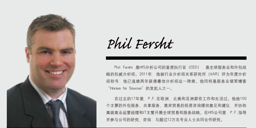 Martyn Hart。Phil Fersht:这个产业正处在一个高级阶段,尤其是在近两三年,我们急需为客户寻找更多商机,而我们的客户也同样在寻求自己的业务发展规划。对此,讨论“外包”这个名称真的没有多大意义,它只是一个外化过程的代名词。在我们这个产业里,更应该讨论的是我们该如何获得新的价值;如何更好地让各利益相关方保持步调一致;如何确定当公司高层签订了一份合同后,商业目标能够由上至下得到有效的执行,该怎样才能了解业务经理和客户是否认同。所以我认为我们正在经历一个世代更替的阶段,需要重新审视整个行业,核心利益方的角色以及承担的责任也将会发生转变。
