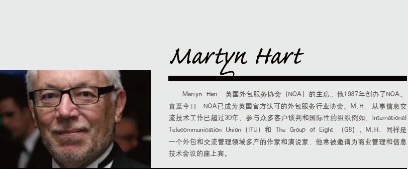 Martyn Hart:NOA(英国国家外包协会)创建于1987年,以今天来说,这已经是很久以前了。但是外包产业则要出现则要追溯到更早。NOA在创建之初遇到的一个最实际的问题是如何定义外包服务产业。你所说的“外化”,其实正是法国对外包服务产业的称呼。我们也还在纠结如何给外包服务产业命名,不能仅仅是贸易或者外化,这个名字一定要对我们这些了解这个行业的人有意义。(因为法国也不再使用outsourcing这个术语来指代这个行业了)