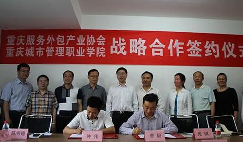 重庆市对外贸易经济委员会副主任张钢、市服务外包产业协会秘书长钟伟、重庆城市管理职业学院副院长曹毅等出席签字仪式。