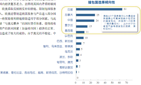 综上所述,欧美国家一方面将面临来自新兴经济体与日俱增的竞争压力,另一方面欧美国家的贸易保护主义政策也将对发包到上述国家的离岸外包业务起到一定的负面影响。