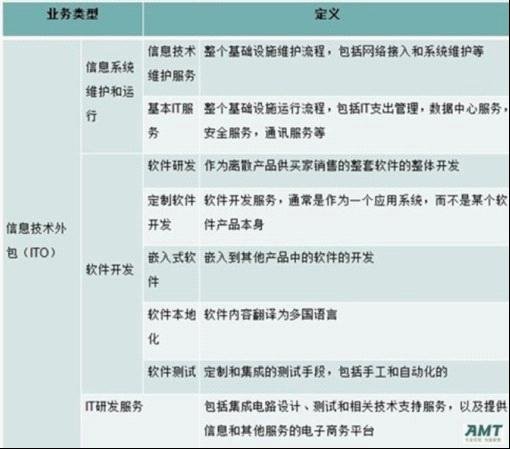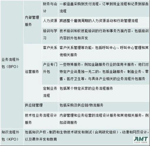 从理论上讲,任何商业活动都可以被外包出去,但是最活跃的两个领域还是信息技术外包(ITO)和业务流程外包(BPO),另外一部分是作为高端外包服务,并为业务流程外包提供辅助服务的知识流程外包(KPO),如表1。就像外包市场在不断动态变化一样,服务外包这一术语的范畴也是如此。例如,许多不同的外包提供商和客户对于信息技术外包(ITO)就有不同的定义。一般而言,信息技术外包是指IT流程的外包,旨在提供与IT相关的产品和服务,例如定制开发的软件应用和数据服务器等IT资产的管理或维护。同样地,业务流程外包(BPO)也有许多不同的解释,权威的市场研究公司Gartner将业务流程外包定义为“将一个或多个信息技术密集型业务流程委托给某个外部提供商,后者反过来根据已界定并可衡量的业绩指标,控制、支配和管理选定的流程”,包括企业服务、供应管理、需求管理和运营。另一方面,许多公司认为,业务流程外包是指由专门的服务提供商负责提供并管理的特定类型的业务流程。业务流程往往是以业务为导向的,而非战略性的;从盈利能力来看,它们一般是业务量大而利润低的流程,很少涉及某个企业的差异化核心活动。