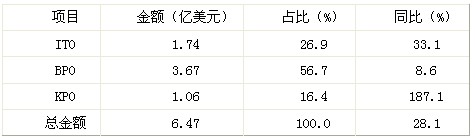 2013年上半年,全省服务外包继续持续快速增长,纳入商务部统计系统的服务外包执行金额6.47亿美元,同比增长28.1%;其中,信息技术外包(ITO) 、业务流程外包(BPO)和知识流程外包(KPO)执行金额分别占执行总额的26.9%56.7%16.4%,同比分别增长33.1%8.6%1.87倍。