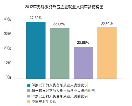 同时,服务外包对无锡本地人才就业的拉动作用明显。从企业统计情况看,超过1/3的服务外包企业招收了50%以上的本地籍员工;就业人员以年轻人为主,其中35岁以下从业人员占67.7%,28岁以下从业人员占37.6%。由此可见,服务外包产业的发展,对于增加就业机会、尤其是促进大学生就业、提高劳动力整体素质和改善人口结构具有重要作用。