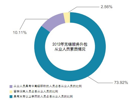 三是从业人才素质高,人均贡献大。统计显示,2012年,无锡服务外包从业人员中,具有大专以上学历的占从业人员总数的比例为73.92%,具有中高级职称的占从业人员总数的比例约为10.11%,留学归国人员占从业人员总数的2.56%。
