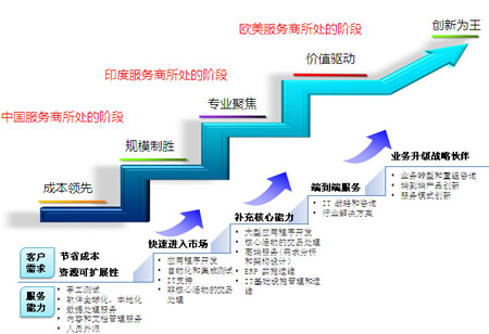 促进内需市场——新技术革命将带来中国本土企业新一轮信息化和服务化的发展高潮。对比印度,印度的外包服务是趁着千年虫的机会直接进入了美国市场,而我国则是通过跨国服务供应商在中国的转移服务而启动的,所以国内企业的离岸市场能力存在着先天不足,而国内市场则是中国服务外包企业的先天优势。通过引导内需市场提升国内企业的服务能力,同时通过鼓励国内企业与海外企业的合作,让渡市场获得海外外包订单和技术能力,可以有效的支持服务外包企业的转型发展。巅峰软件的离岸OBC模式就是这个思路的一个尝试。