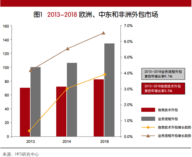 持续复苏的初步迹象始于2013年,根据Hfs研究中心的“外包状态”调查研究表明部分买家与前两年相比对外包兴趣更加强烈了。但这些兴趣并没有立即促成外包的成交合同,直至2013年中旬在法国、德国、北欧以及比利时等国获得合约的顺利签署。政府信息通信部通过该地区的资讯服务与系统集成收益均在2013年第三与第四季度有所提升。对于外包产业而言,这是一个令人鼓舞的良好迹象,因为外包费用一直是以资讯费用的提高为基础。2014年HFs的观点认为欧洲信息技术外包与业务流程外包费用与往年相比更有信心。图一表明了2013-2018年欧洲外包市场规模与增长预测。