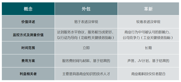 在外包创新的过程中,价值对于卖家和客户来说都非常具有挑战性。在外包服务中,价值在交付时被公平的定义,测量及决定。但是,在外包创新中,价值会通过不同的形式表现。有时革新中的价值会被货币化。比如IBM和它的客户在一些联合项目中获得了相当广泛的媒体关注,尽管这些投资的具体收益不总是那么明确。