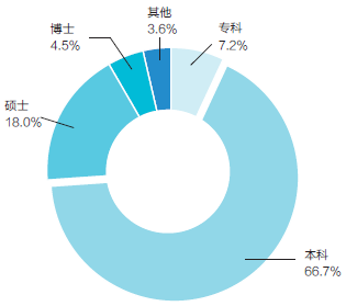 调研数据显示,2014年园区所有员工中,本科占比66.7%,硕士占比18.0%,博士占比4.5%,专科占比7.2%,其它占比3.6%,本科及以上学历员工占所有员工的89.2%。总体来看,园区目前的学历分布合理,整体素质偏向高端。