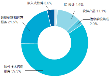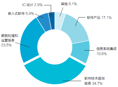 调研数据显示,2014年园区员工34.7%分布在软件技术咨询服务类企业,23.5%分布在数据处理和运营服务类企业,17.1%分布在软件产品类企业。