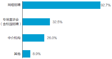 调研数据显示,2014年园区企业在招聘方式上有多种选择,有93.7%的企业选择网络招聘,40.9%的企业选择专场招聘,28.3%的企业选择中介机构,11.8%的企业选择其他渠道。其中选择企业渠道的厂商中,内部推荐是比较重要的招聘方式,特别是在小微型企业中。