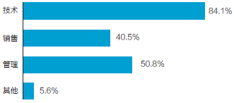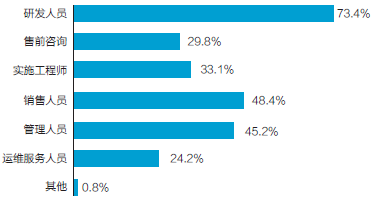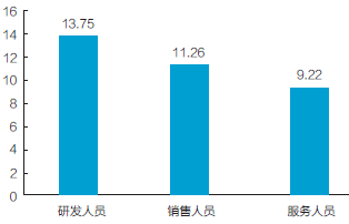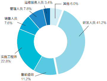 调研数据显示,2014年园区所有岗位中,研发技术类人员(包括研发人员、实施工程师、售前咨询)占总人数的75.2%。其中,研发人员占比41.2%,实施工程师占比 22.8%,售前咨询占比11.2%。