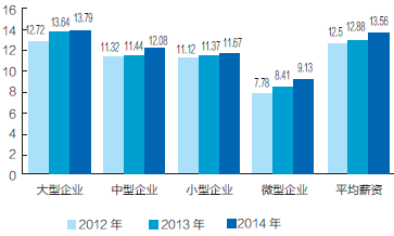 调研数据显示,2014 年园区企业平均年薪根据企业规模由大到小递减。大型企业员工平均年薪最高,达13.79万元。