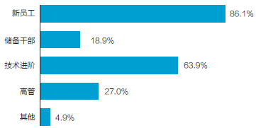 调研数据显示,2014年园区企业中86.1%的企业提供新员工培训,63.9%的企业提供技术进阶培训,提供高管、储备干部和其他类别的培训的企业分别占比27.0%、18.9%和4.9%。