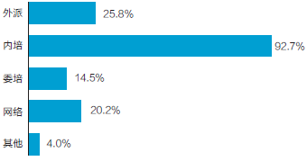 调研数据显示,2014年园区92.7%的企业选择内部培训方式来培养人才,25.8%的企业选择人才外派进行培养,20.2%和14.5%的企业选择网络和委培的方式来培养人才,还有4%的企业会采取其他方式对人才进行培养。与2013年相比,采用网络培训企业数量有了很大程度的提高。