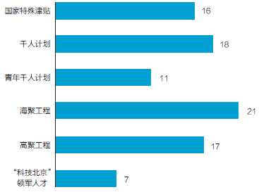 调研数据显示,2014年园区高端人才共有79人,其中, 16人享有国家特殊津贴,18人入选“千人计划”,11人入选“青年千人计划”,1人入选“百千万人才工程”,1人入选“外专千人计划”,21人入选“海聚工程”,17人入选“高聚工程”,7人入选“科技北京”领军人才。