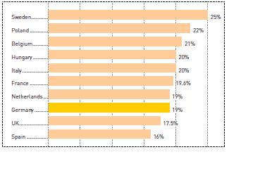 然而,如下面的图表三所示,德国19%的附加值税率相对其他国家来说却是比较低的。