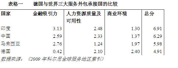 怎么来解释这个现象呢?劳动力成本只是潜在的客户在寻找外包服务供应商时考虑的一个维度。他们考虑的因素还包括特定国家的人员技术水平及商业环境。成本高的国家可以通过高质量的劳动力、良好的基础设施和稳定的政治环境来加以补偿。我们可以通过简略地看一下前面提到的《2009年科尔尼全球服务地区索引》来分析一下。经过三个维度(金融吸引力、人力资源的质量和可用性及商业环境)的计算之后,德国得到了4.91的总分,而印度得到了6.91分。表格一是对德国和几个名列前茅的服务外包承接国进行的比较。