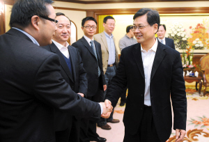 市长陈云贤(右一)和前来参加金融服务外包高级研讨会的嘉宾们亲切握手。崔景印 摄