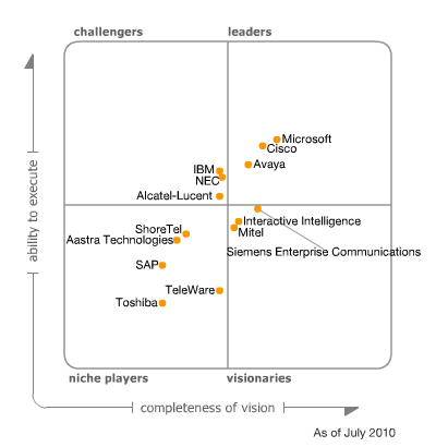 Gartner最近公布了第七届年度统一通信“魔力象限”评选结果,微软、思科和Avaya入选第一象限——领导者象限。