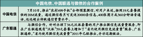 业界普遍认为微信与运营商合作是必然,特别是电信和联通,最有可能联手腾讯向移动发动进攻。事实上,中国电信面向广大农村智能机用户推出“农村499手机”全部预装微信,广东联通也与微信合作,针对办理了36元沃派套餐的用户推出微信免流量费服务。知名独立IT评论人洪波对本报记者说, 三大运营商内部的竞争激烈程度,超过了他们与腾讯等企业之间的竞争。