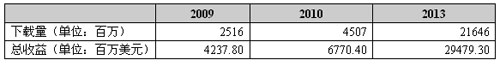 以上数据显示,2009年全球移动应用下载总收益超过42亿美元,2013年底将达到295亿美元。这个收益预测包括终端用户的付费下载应用以及广告赞助的免费应用。其中,广告赞助的移动应用到2013年比例将达25%。