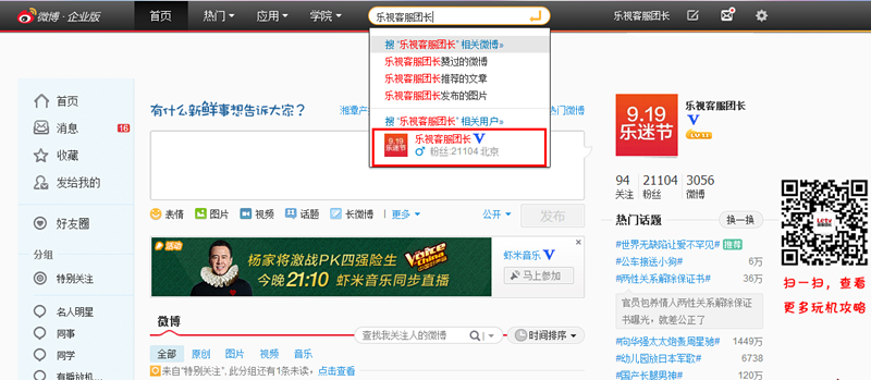 微博是客服团长每天最活跃的地方,只要搜索乐视客服团长关注即可。微博通过评论,私信等回复方式拉近了我们和乐迷的距离。团长每天都会在微博上发布关于我们产品,服务,应用和玩机相关的图文消息,以便用最简单的方式把信息传递给大家。
