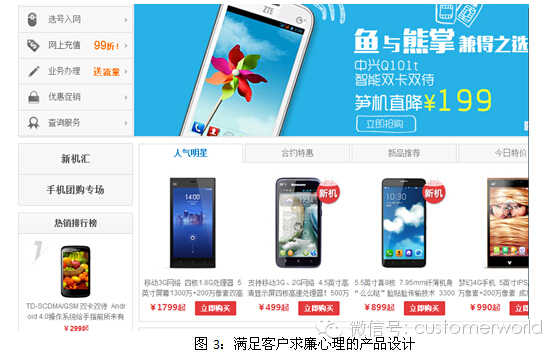 求廉动机:考虑到很多手机是客户没有接触过,没有触感和实际体验,只能通过图片和文字说明来介绍产品,因而移动官网超80%的机型为千元以下机型,充分利用客户的消费冲动,通过低廉的价格,精准而富有吸引力的描述来吸引客户在线购买并支付,完成消费。同时官网充值99折也是利用客户追求较低价格的心态,吸引客户在电子渠道充值缴费。