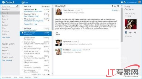Outlook.com采用的Metro界面使它的界面更清晰。此外,Outlook.com集成社交网络功能。不用标准的电子邮件收件箱,用户将能够看到Facebook、谷歌、Twitter和LinkedIn等网站的状态更新和内容。微软还计划用Skype增强Outlook.com的功能,为其提供类似于Gmail的“Google Talk”功能。