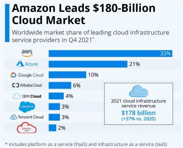 海外分析机构给出的数据给出了2021年Q4全球八朵云的市场份额,其中阿里云以6%的市场份额位居第四名,腾讯云则以3%的份额位居中国第二大、全球第七名,位居腾讯之后的则是oracle,oracle占有2%的市场份额。